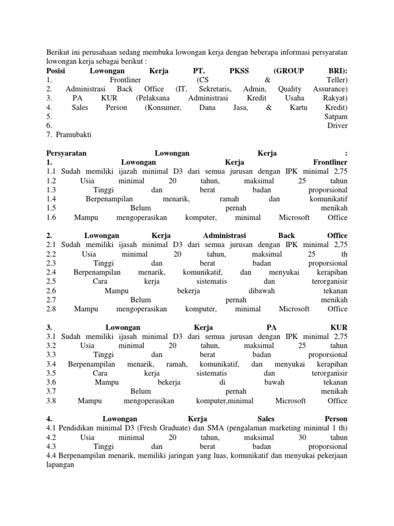 Lowongan kerja pt pkss bank bri group lowongan kerja bumn bank rakyat indonesia bri lowongan kerja pt incasi raya padang staff. Lowongan kerja pt pkss bank bri group lowongan kerja bumn bank rakyat indonesia bri lowongan kerja pt incasi raya padang staff. Contoh soal psikotes bank mandiri bca bni danamon btn dan jawabannya seri deret matematika di download ebook pdf.