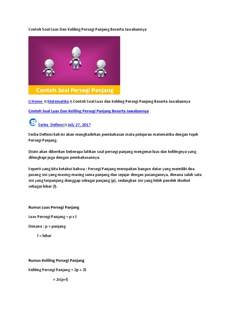 Contoh Soal Keliling Persegi Panjang Beserta Jawabannya. Cara menghitung rumus keliling persegi panjang dan contoh soalnya. Berapakah panjang sisi sawah tersebut?
