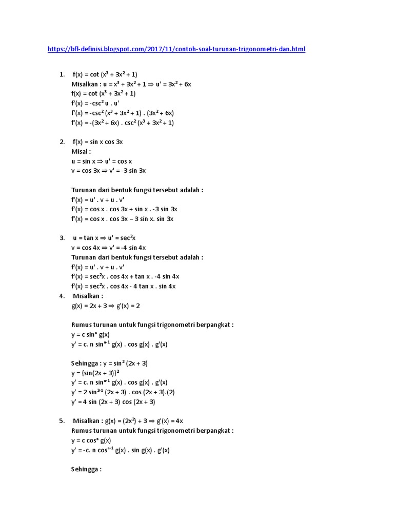 Kamu sudah mengenal yang dimaksud dengan trigonometri? Demikian informasi mengenai rumus turunan fungsi trigonometri yang sudah. F(x) = 3 cos x. Untuk memahami konsep tersebut silahkan anda perhatikan contoh soal berikut.